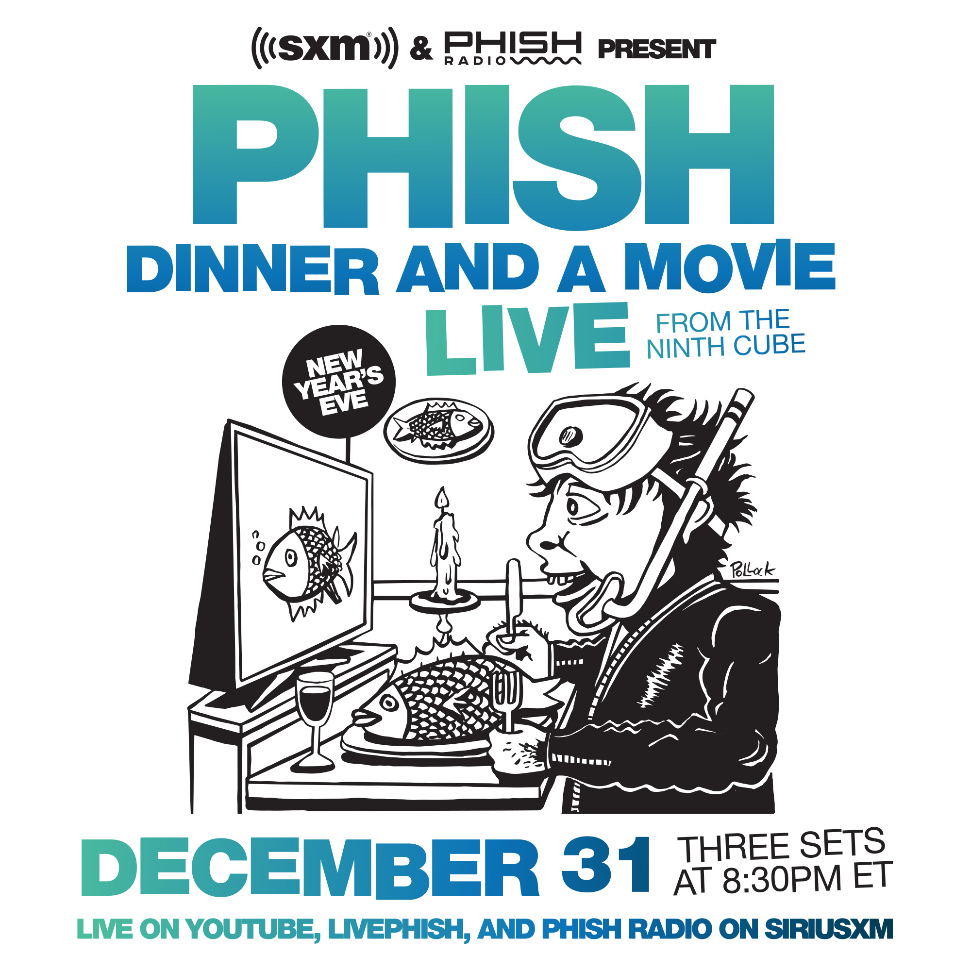 Phish will perform three full sets this New Years Eve LIVE from the Ninth Cube. The next installment of Dinner And A Movie features Phishs July 9 2019 show at Mohegan Sun Arena in Uncasville CT. The March 31 event features Phishs July 24 2014 show at the Merriweather Post Pavilion in Columbia Md.
